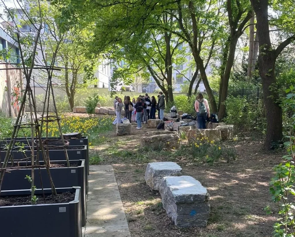 Die baustellengeplagte Schulgemeinschaft wünscht sich einen Ausbau von einzelnen Grünflächen und Hochbeeten zu einem echten Schulgarten und die Einrichtung eines grünen Klassenzimmers.